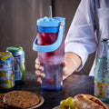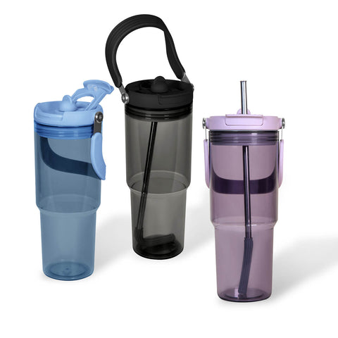 Termo de plastico de una pared. Incluye tapa con cierre de rosca que ofrece dos alternativas de uso, sobre tapa con sistema push y ranura especial para popote con aditamento para cerrar y evitar derrames. Incluye popote metalico que cuenta con un mecanismo de salida automatica y una base de silicon, que lo eleva al abrir el compartimento. Ademas, su practica asa plegable, permite llevarlo comodamente a cualquier lugar. Capacidad 28 Oz. Base de 7 cm de diametro. Incluye caja individual.