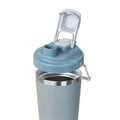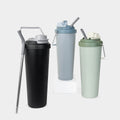 Termo doble pared. Cerrado al vacio. Pared interna y externa acero inoxidable. Cuerpo con terminado rugoso. Tapa de plastico con sistema de rosca y doble sobretapa con cierre push, una con boquilla para beber y otra con ranura para popote. Agrega un asa metalica con recubrimiento de silicon para llevarlo contigo a todos lados. Mantiene la temperatura caliente por 4 hrs y la temperatura fria por 8 hrs. Capacidad de 25 Oz. Base de 7 cm de diametro. Incluye caja individual.