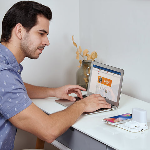 Cargador inalambrico para smartphone y earbuds. Incluye lampara touch con 3 diferentes intensidades. Salida USB para conectar otro dispositivo como por ejemplo un smartwatch. Incluye cable auxiliar tipo C y caja individual.