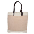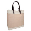 Bolsa de yute cosida con asas de curpiel y fuelle.