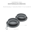 Plato doble compartimento para alimento de mascota fabricado en plástico, con capacidad de 250 ml. Con diseño plegable que facilita su traslado, incluye arnés metálico.