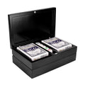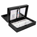 Incluye estuche de madera con 5 dados, 2 barajas plastificadas y domino de 28 piezas.
