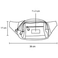 Cangurera con 4 compartimentos, 3 en la parte frontal, 1 en la parte trasera, cinta ajustable a la cintura y broche de seguridad a presión.